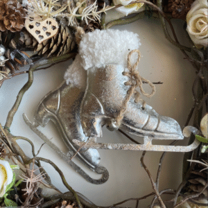 Jõulupärg “Hõbeuisu Süda” on südamekujuline ukse‑ või seinakaunistus, mis ühendab armastuse sümboli ja talvise nostalgia. Pärja keskmes säravad hõbedased vintage uisud, mis toovad esile mälestused lumistest talveõhtutest, uisuväljakute rõõmust ja romantilisest meeleolust.